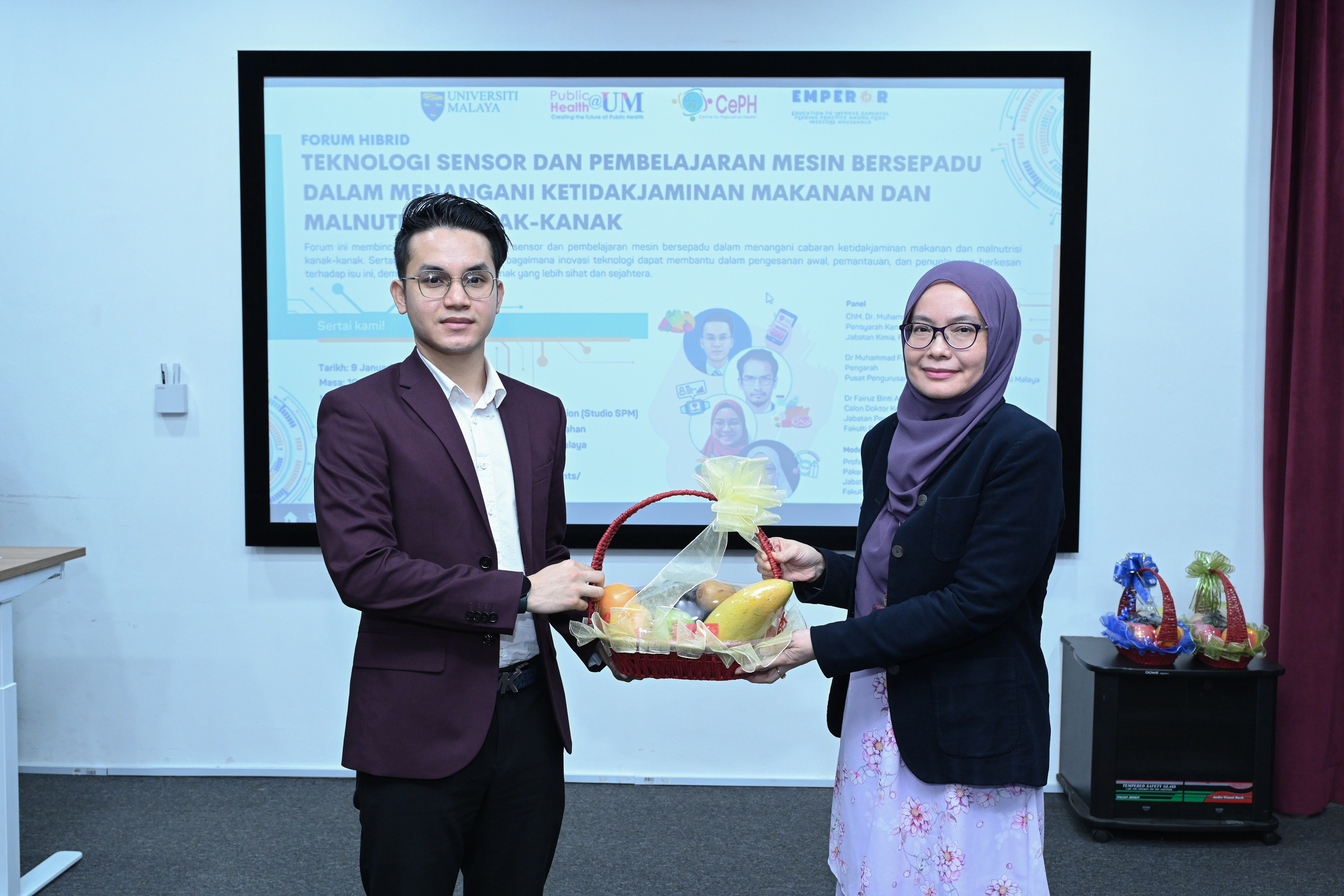 On Thursday, 9th January 2025, the Forum on Sensor Technology and Integrated Machine Learning to Address Food Insecurity and Child Malnutrition was successfully organized by the Education to Improve Parental Feeding Practice Among Food Insecure Households (EMPEROR) Research Team in collaboration with the Centre for Population Health (CePH), under the Department of Social and Preventive Medicine, Faculty of Medicine, Universiti Malaya. The forum took place at the Regional Training Centre in the Western Pacific Region, located on Level 5, Block J, Faculty of Medicine, Universiti Malaya, and was attended by approximately 100 participants, both in-person and online, including attendees from Malaysia and abroad, particularly from Indonesia.